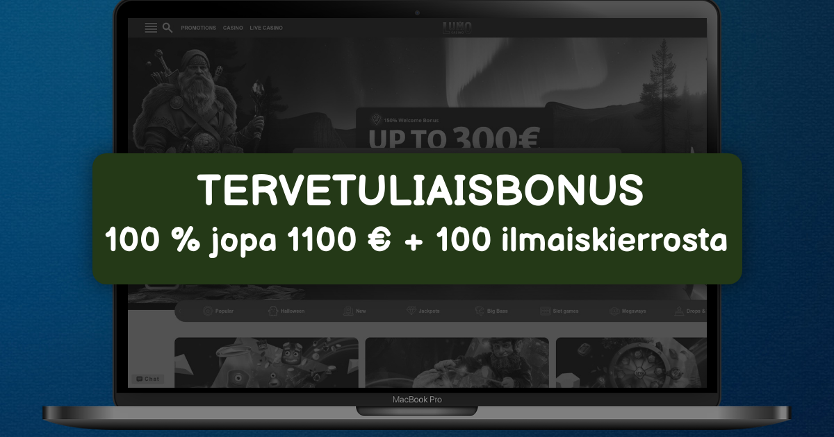 Uudet pelaajat saavat Lumo Casinossa houkuttelevan tervetuliaisbonus paketin, joka sisältää 150 % bonuksen ensimmäiseen talletukseen 300 euroon asti. Tämä tarkoittaa käytännössä sitä, että 200 euron talletuksella pelaaja saa käyttöönsä yhteensä 500 euroa pelirahaa. Lisäksi bonuspakettiin kuuluu 50 ilmaiskierrosta suosittuun Reactoonz-peliin.